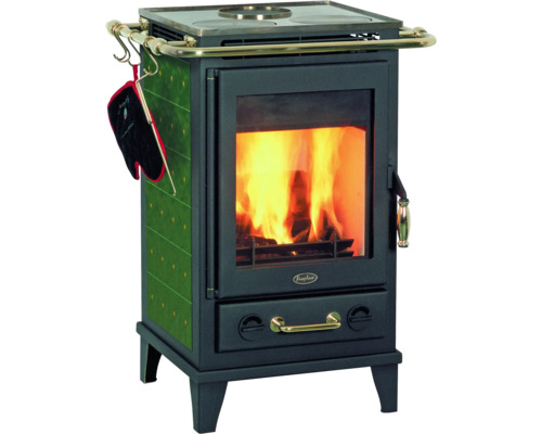 La stufa Florenz è una stufa a legna a combustione continua con design a camino, adatta per il riscaldamento e la cottura. Il rivestimento in ceramica verde dona un tocco elegante e facilita la distribuzione uniforme del calore.